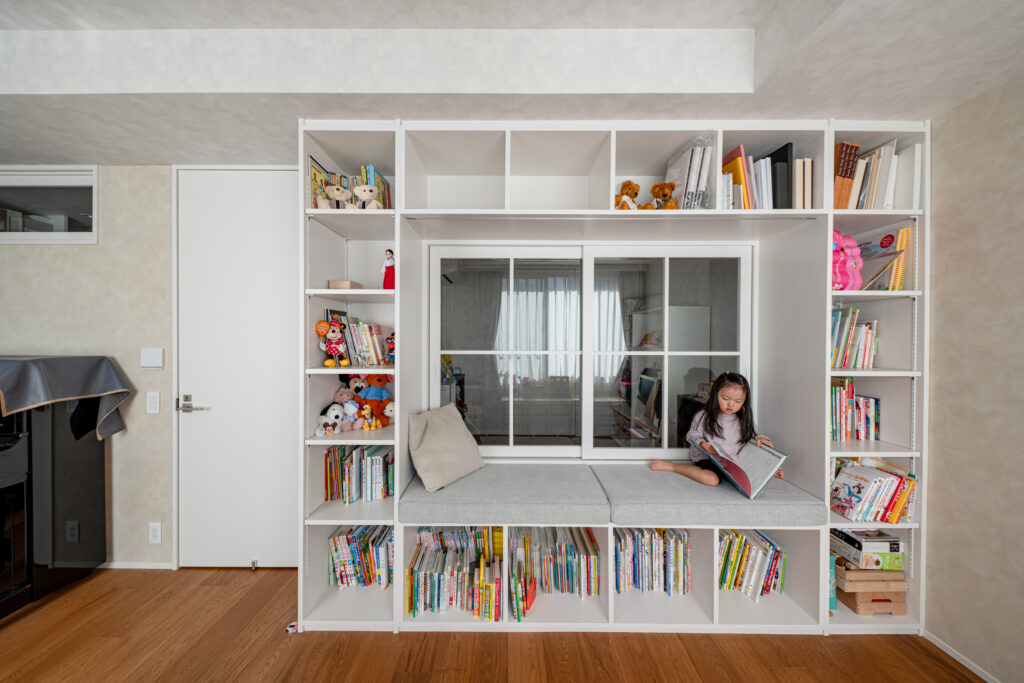 ガラスブロック部分から室内の光が漏れてくるので、子どもを寝かしつける際、うっすらLDKの気配を感じられ、安心して眠れるようです。